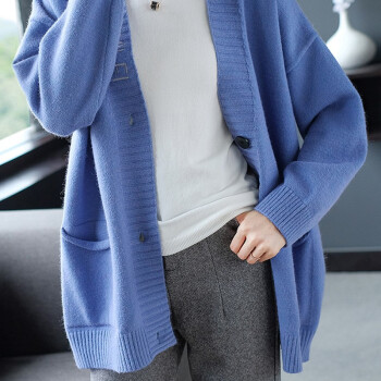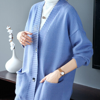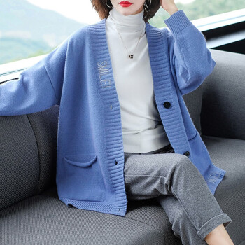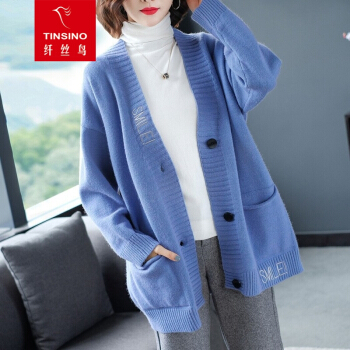 纤丝鸟 TINSINO 针织衫女秋冬新款韩版宽松刺绣针织开衫女休闲毛衣通勤毛线衣外套 蓝色 请拍正确尺码 |