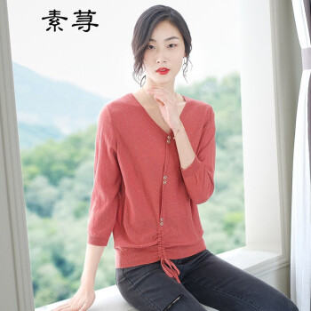 素荨针织衫女V领亮丝上衣秋装新款薄款毛衣宽松七分袖打底衫 砖红色1213 M |