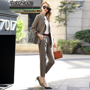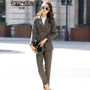 YUUZYUUS妤遇小西装女秋季新款韩版大牌时尚气质优雅格子裤子女职业装两件套套装女装 红线格子(两件套 配腰带、 ) M |