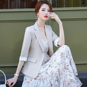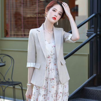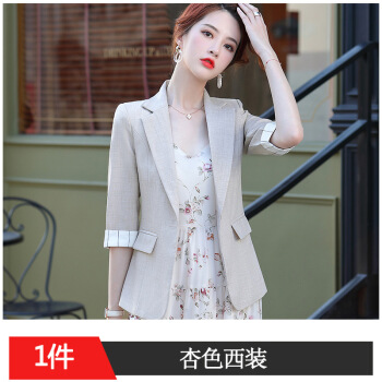 夏天潮流新品 蓝色小西装外套女韩版夏季薄款条纹英伦修身时尚职业西服上班可穿 杏色西装 S |