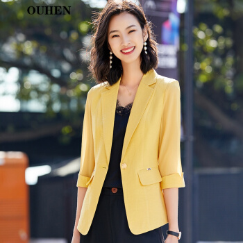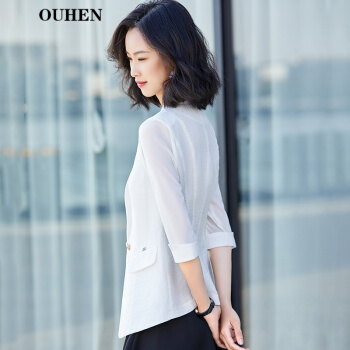 OUHEN轻奢品牌女装小西装外套女夏季新款薄款白色七分袖韩版休闲网纱拼接西服女上衣 白色中袖西装 L(建议96-105斤) |