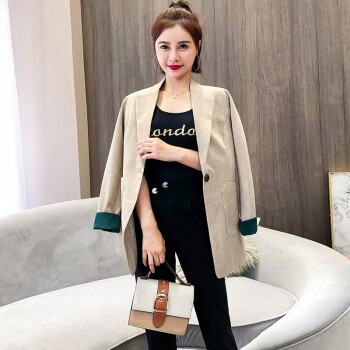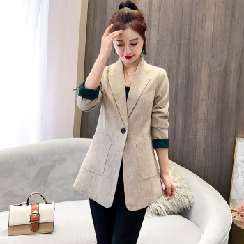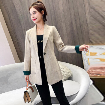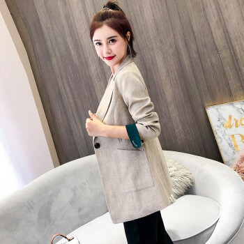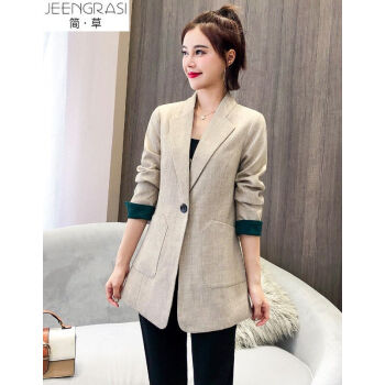 简草 小西装女中长款秋季新款时尚潮流宽松显瘦气质休闲韩版长袖一粒扣西服外套女Z911 米色 S |