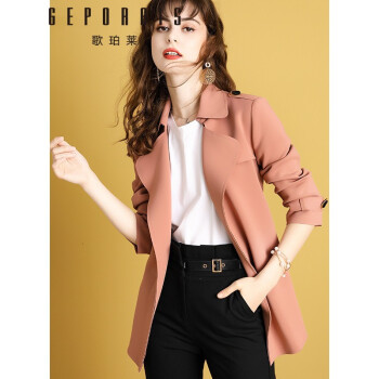 歌珀莱品牌女装中长款风衣外套女新款秋装气质英伦风小个子大衣外套 烟粉色 S |