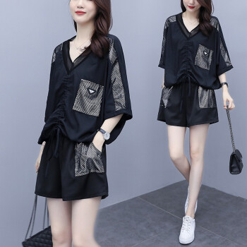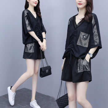 芷依丽 时尚大码胖MM套装女夏季新款宽松短袖上衣女T恤休闲阔腿短裤运动两件套 黑色 L |
