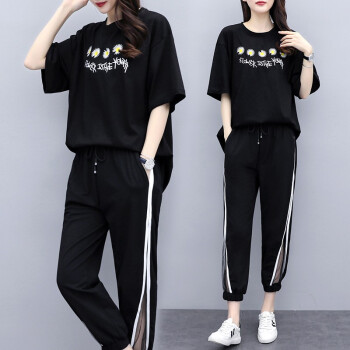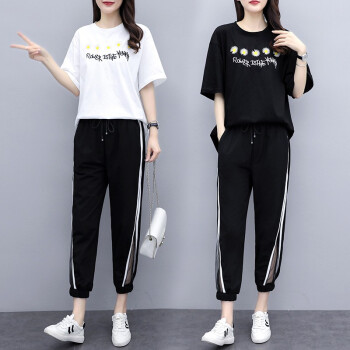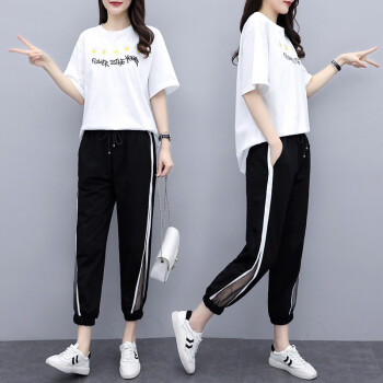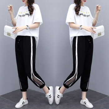 睡妍 大码女装套装女夏夏季新品宽松显瘦加肥加大码胖mm短袖T恤九分裤休闲运动套装两件套女夏 白色 XXL(120-140左右) |