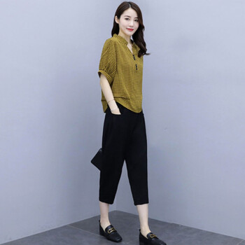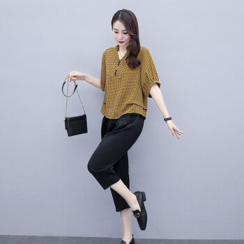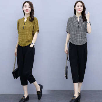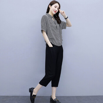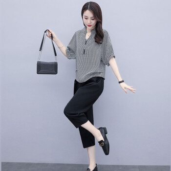 卿依瑟 大码女装棉麻套装女夏季修身显瘦V领格子时尚上衣七分休闲裤俩件套装女潮 黑色 M |