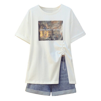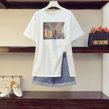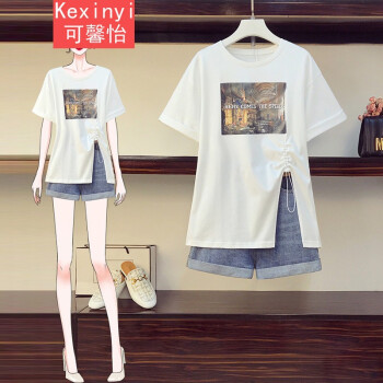 可馨怡 加肥加大码女装胖mm新款胖妹妹夏装200斤洋气遮肚子显瘦t恤牛仔短裤时尚两件套装 套装 XXXL(建议150-175斤左右) |