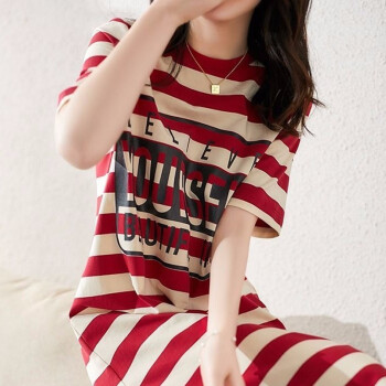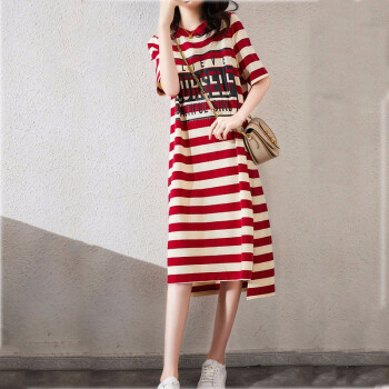 凝拉连衣裙女中长款夏季新款字母印花女装韩版时尚雪纺大码百搭气质圆领裙子 红条纹 2XL(建议145-160斤) |
