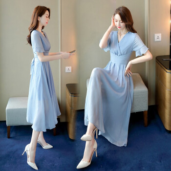 信和祥雪纺连衣裙女夏季流行新款简约V领通勤荷叶袖中长款纯色短袖夏天气质裙子 粉色 L |
