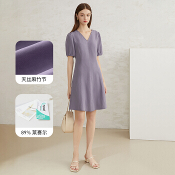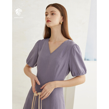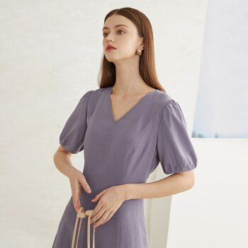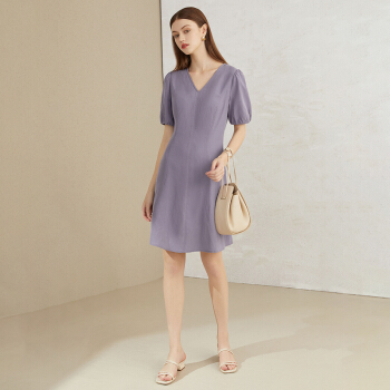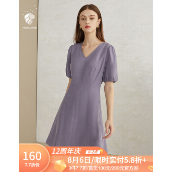 范思蓝恩 新款夏季泡泡袖V领连衣裙收腰显瘦气质女神范a字裙 紫色 L |