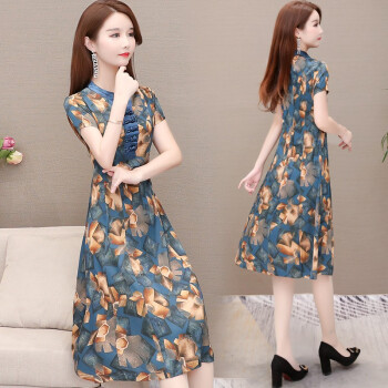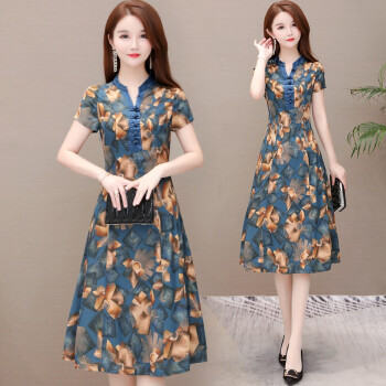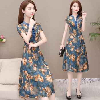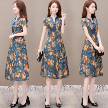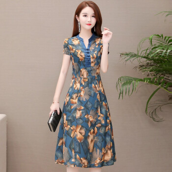 格素凡 连衣裙女夏装新款韩版V领雪纺碎花长裙阔太太旗袍式中长款显瘦印花过膝蕾丝裙子大码女装潮 蓝色(F92) 女-L 建议体重90-105斤 |