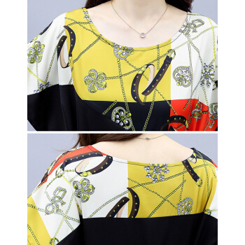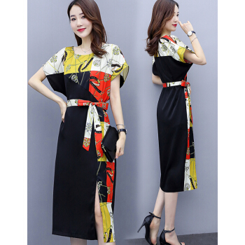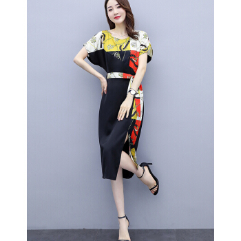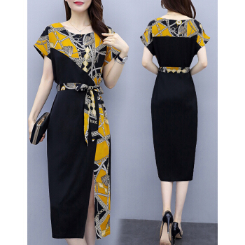 婪澈连衣裙女女装夏季新款时尚印花收腰直筒显瘦气质短袖裙子夏天 黄花 请下正确尺码 |