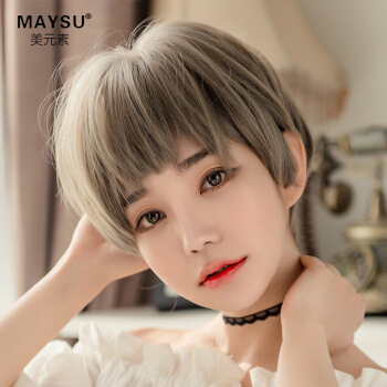 美元素 假发女狗啃式二次元刘海短发自然逼真奶奶灰不规则bobo头女士假发套 图片色(青木亚麻灰) |