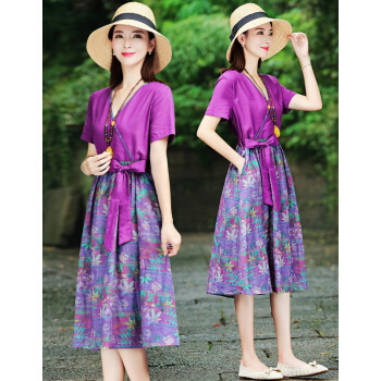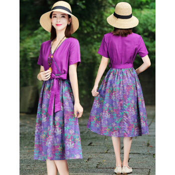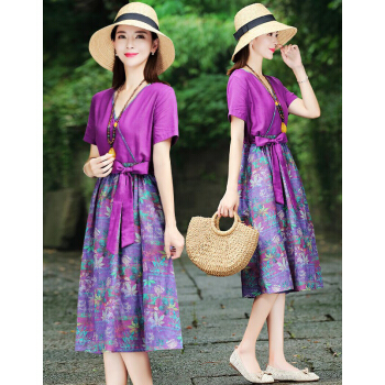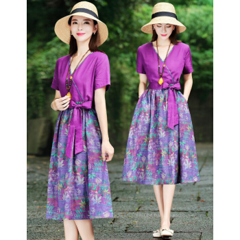 苏洛琳雪纺连衣裙女夏季新款大码女装时尚气质女士棉麻中长印小个子碎花连衣裙蕾丝裙子女 图片色 M |