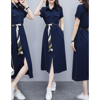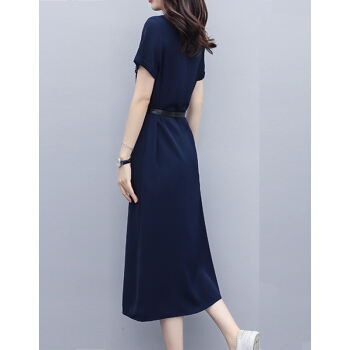 莱倪晟纳短袖连衣裙女装夏装新款韩版修身气质系带高腰显瘦开叉减龄中长裙潮 藏青色 请拍正确尺码 |