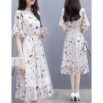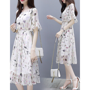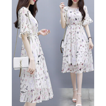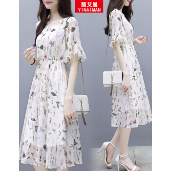 茵艾曼连衣裙女雪纺夏季新款女装韩版小个子时尚潮港味印花短袖中长款裙子 A386图片色 M《100-110斤》 |