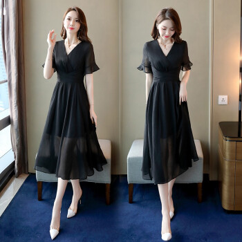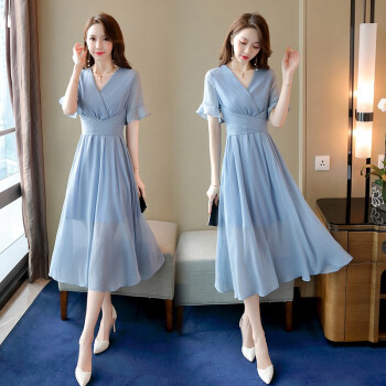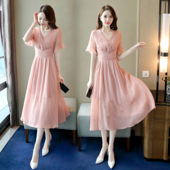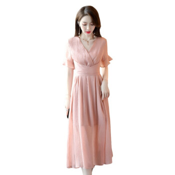 信和祥雪纺连衣裙女夏季流行新款简约V领通勤荷叶袖中长款纯色短袖夏天气质裙子 粉色 L |