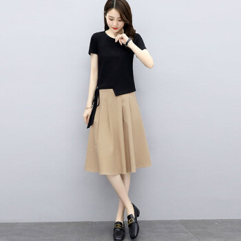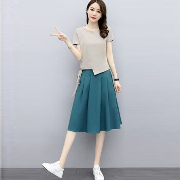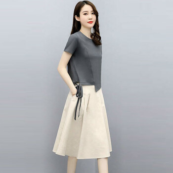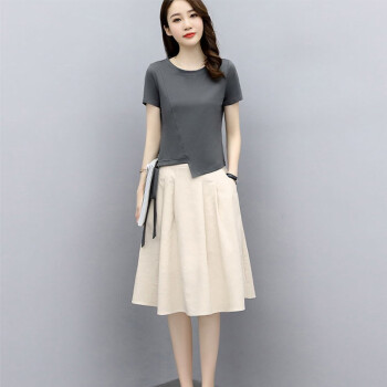 莱倪晟纳连衣裙新品女装夏季短袖时尚洋气宽松两件套中长款裙子 灰色上衣+米白裙子 请拍正确尺码 |