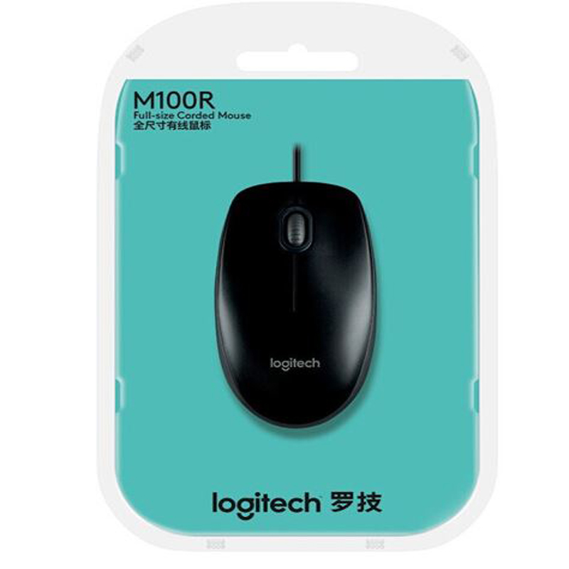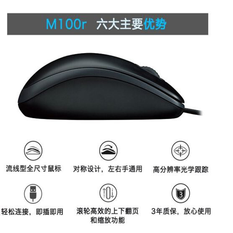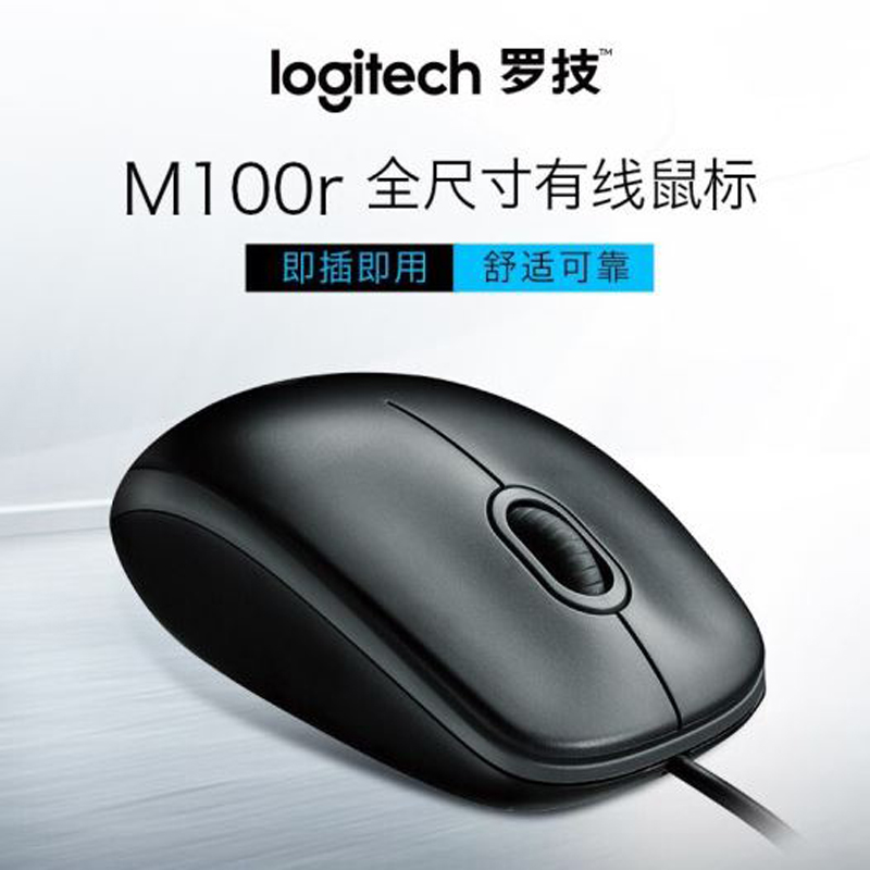 罗技M100r有线鼠标USB接口全尺寸对称设计左右手通用商务办公家用鼠标即插即用笔记本电脑苹果MAC M100r 黑色 |