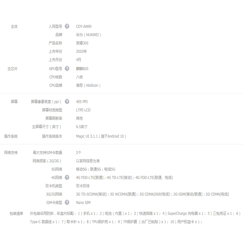 荣耀30S 双模5G 麒麟820 5G SOC芯片 8GB+256GB 蝶羽翠【其他/蝶羽翠】 |