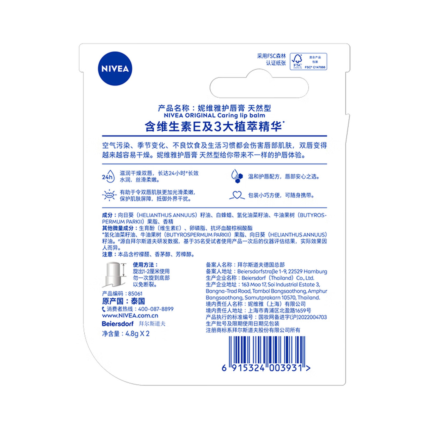 妮维雅(NIVEA)天然型润唇膏双支装4.8g*2男女适用 |