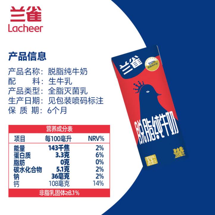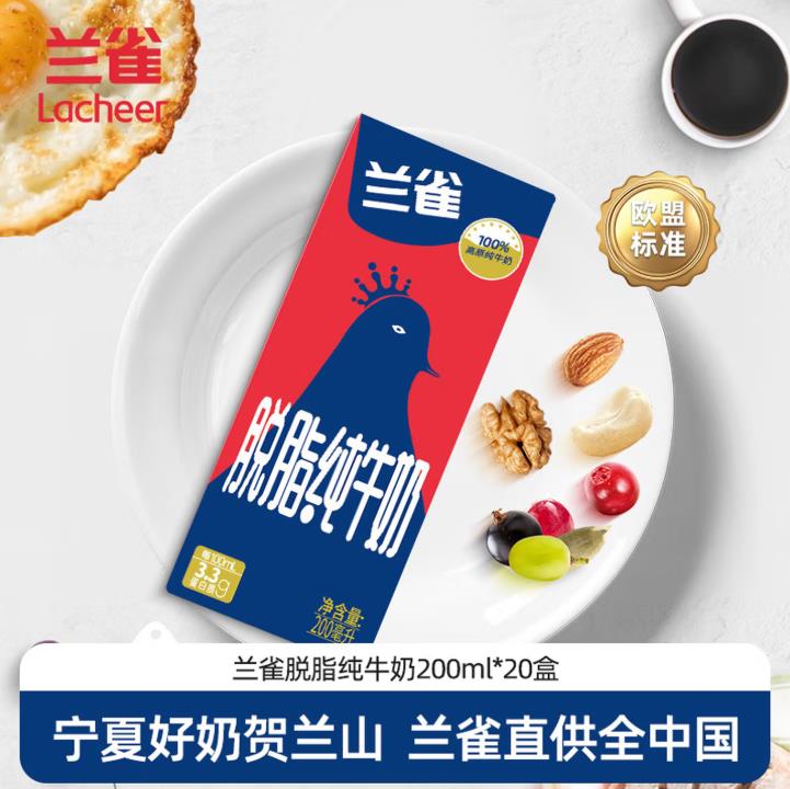 兰雀Lacheer3.3g脱脂纯牛奶200ml*20盒 |